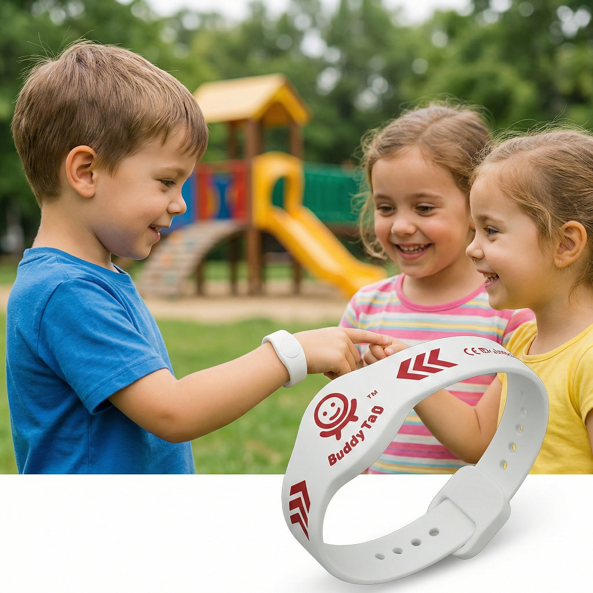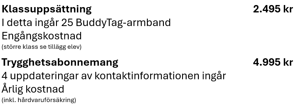 Det hållbara armbandet BuddyTag™ innehåller information som gör att någon hjälpsam person med mobiltelefon snabbt kan kontakta den ansvarige läraren eller skolan. Sedan kan barnet snabbt lokaliseras och komma tillbaka till sin grupp.